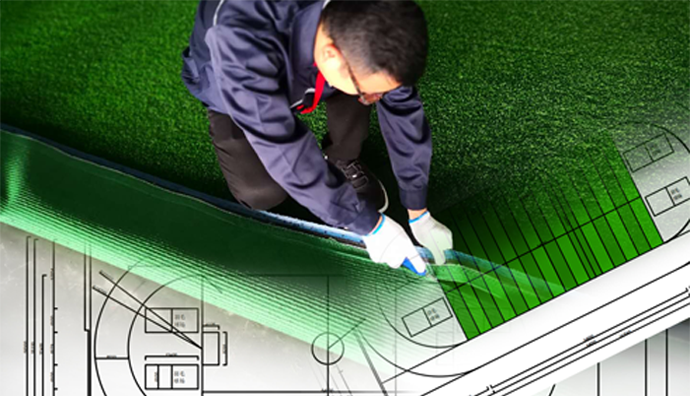 如有图案施工,需按照图案大小在相应的安装位置将原有草坪裁掉,然后用接口带将图案粘接在相应的位置。裁草坪时应严格按照图案大小进行裁切,宁可裁小进行修正,避免裁大进行修补。